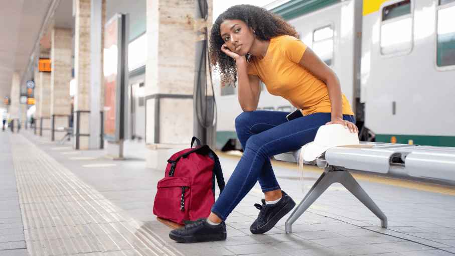 eine Frau wartet an einem Bahnhof