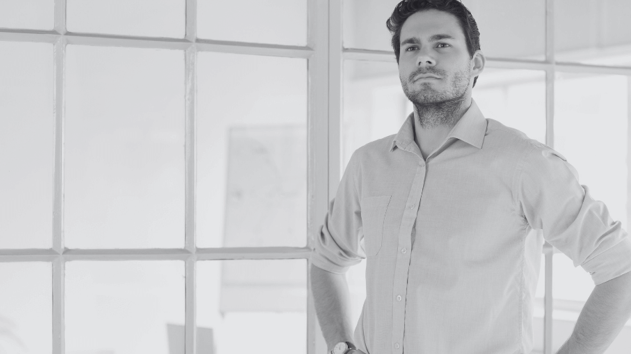 Mann, nachdenklich, mit Händen in den Hüften